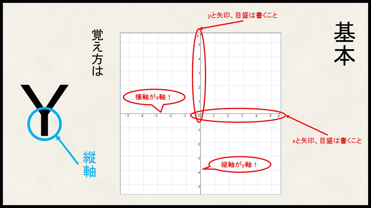 大きくなる方向に矢印を書き、目盛も入れます。どっちがx軸でどっちがy軸になるかわからなくなったときは下の図を思い出してください!