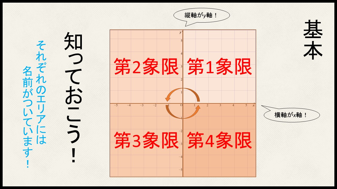 では座標平面について詳しく見ていきましょう。x軸、y軸について